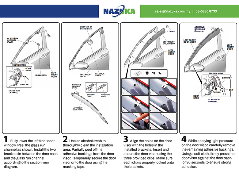 Begin by carefully inserting the clips into the designated window channel slots. Once the clips are properly positioned, align Nazuka door visor along the frame. Slide the door visor into the clips, making sure it fits snugly without forcing it. Secure the door visor firmly using the provided brackets to lock it into place. No drilling required — just precision placement for a strong, lasting fit!
