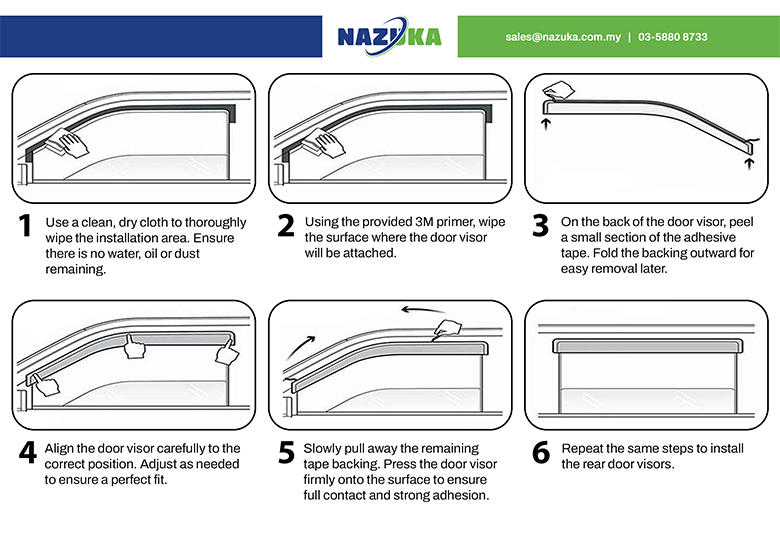 Simply align Nazuka door visor with the door frame, ensuring a snug fit along the edges. Peel off the adhesive backing carefully and press the door visor firmly into place, starting from one end and working across. Apply even pressure to secure it properly. No drilling or special tools needed — just a clean surface and steady hands for a perfect fit!